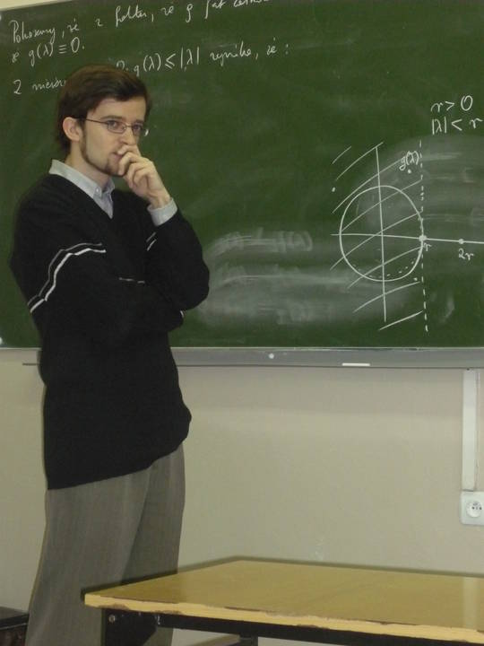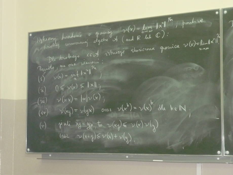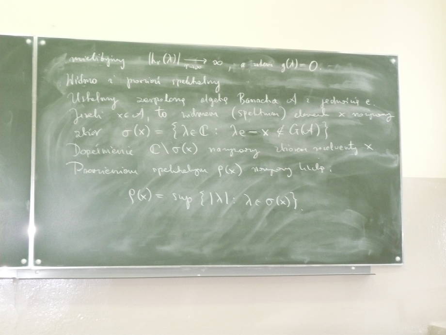 During the lecture we will finish the proof of the Gleason-Kahane-Żelazko theorem and will introduce the notions of spectrum and spectral radius of an element. Afterwards we will state and prove several of the properties of these notions and the theorem about the non-emptiness of the spectrum of an arbitrary element of a complex Banach algebra with identity. A video recording is available after logging in. last update: 08.01.2012